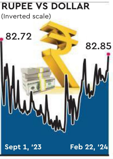 THE INDIAN RUPEE rose on Thursday toa more than five month closing high, aided by an uptick in its Asian peers and on the back of dollar inflows into the domestic share and bond markets. The rupee sett ledat 82.84 to the US dollar, its highest closing level since September 4 after having logged its biggest single-session gain in nearly two months. Throughout the day, the rupee traded in a range of 82.84 and 82.95, after closing at 82.97 in the previous session. It rose to a three week high during the day. The brief outages on various London Stock Exchange Group (LSEG) news and currency trading platforms globally did not have a material impact on the rupee, traders said. “Overall, the reis ahigher potential for the rupee to rise above 82.80, given the robust foreign inflows. But the RBI’s (central bank) firm grip on the currency could limit any further upside,’ said Amit Pabari, managing director at FX advisory firm CR Forex.“ The stability of the rupee is also aiding confidence among investors for a favourable carry set up.” The dollar struggled despite a further decline in the odds of a Federal Reserve rate cut in March or May afterthe minutes of the central bank'slast policy meeting indicated it needs tobe sure that inflationary risks receded before cutting rates. Meanwhile, the dollar/rupee forward premiums dipped, with the one-yearimpliedyield falling tothe lowest in two months. Traders said the RBI's upcoming $5 billion swap maturity was probably leading to a receiving interest, pushing forward premiums lower. The central bank's sell dollars/buy rupees swap matures on March 11. —REUTERS
